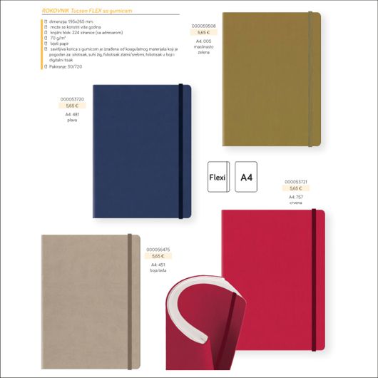 • format: A4• dimenzija: 195x265 mm• može se koristiti više godina• knjižni blok: 224 stranice (sa adresarom)• 70 g/m²• bijeli papir• savitljiva korica s gumicom je izrađena od koagulatnog materijala koji jepogodan za: sitotisak, suhi žig, foliotisak zlatni/srebrni, foliotisak u boji idigitalni tisak• Pakiranje: 30