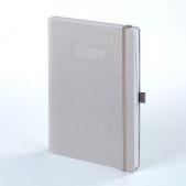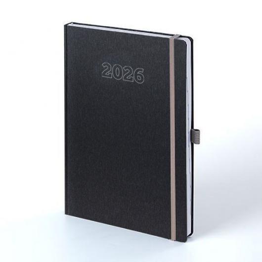 KNJIŽNI BLOK: format: 16,5x23,5 cm; opseg: 336 str.; tisak: 2 boje na bijelom 80 g/m² papiru; sadržaj: dio za upisivanje osob. pod., kalendar za 2026. i 2027., kodovi zemalja svijeta, svjet. praz., vrem. zone, udalj. europ. gradova, trajanje letova između svjet. gradova, mjerne jed., planer za 2026., dnevni planer za 2026. Dnevnik je na 8 jezika (engl., njem., franc., tal., hrv., slov., grč. i rus.); perforirani i zaobljeni uglovi listova • KORICE: korica je izrađena od materijala koji je preporučljiv za foliotisak, sitotisak i digitalni tisak; zaobljeni uglovi; siva gumica; siva gumica-držač za olovke